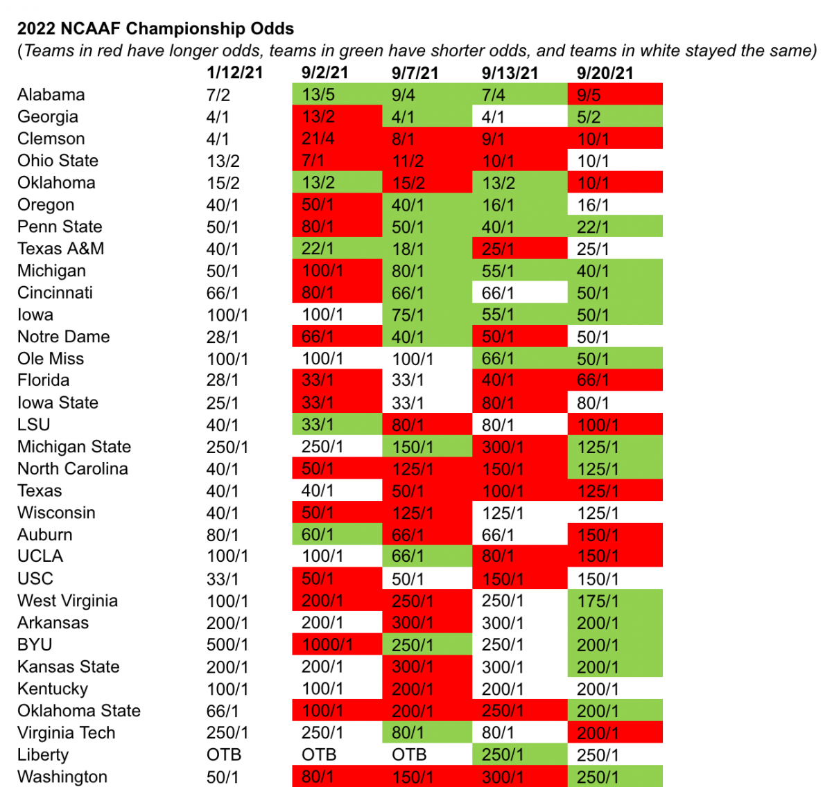 This is neat and all, but I really don't read all that much into it because these odds basically just suggest that Alabama and Georgia are the two best teams in the country, and behind them is a gigantic ¯\_(ツ)_/¯, which is pretty much what everybody with eyes has observed up to this point.