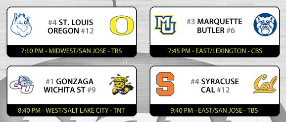| 8:40 PM | #1 Gonzaga vs #9 Wichita St | TNT / NCAA.com | West | Salt Lake City, UT | GONZ (-6½) |