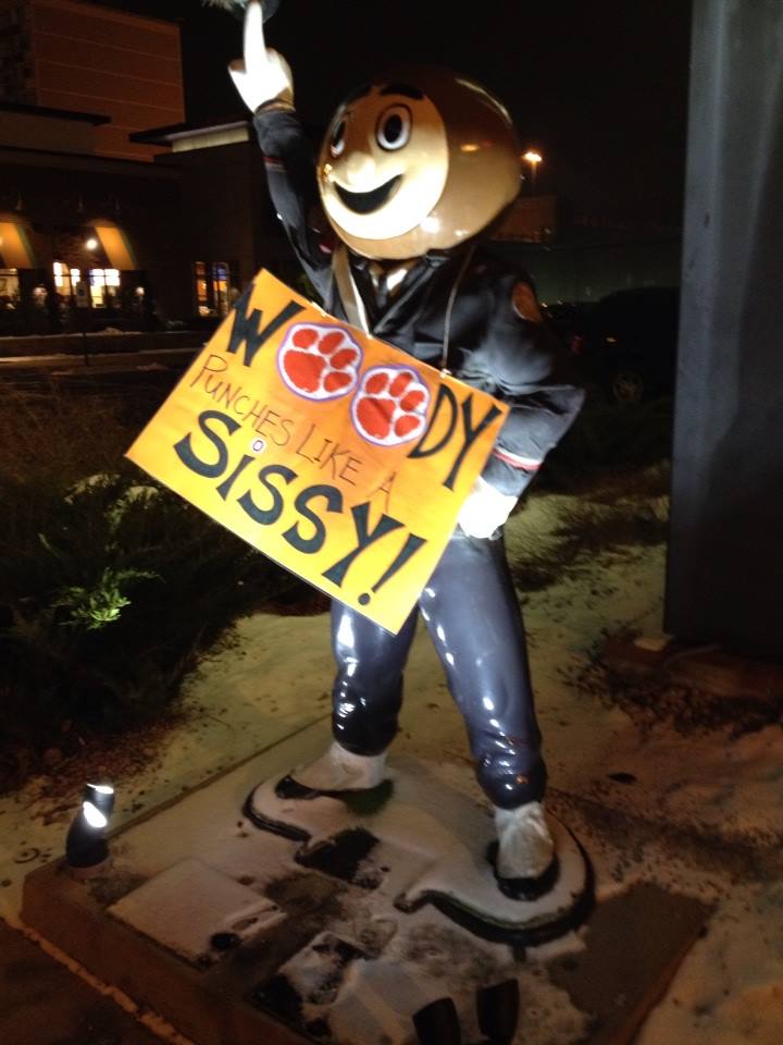 On Monday, we brought you a tip about an Ohio State fan trolling Clemson's Thomas Clemson statue. This is Clemson's response, hanging a sign on the Brutus statue near Panera and Conrad's on Lane Avenue.
