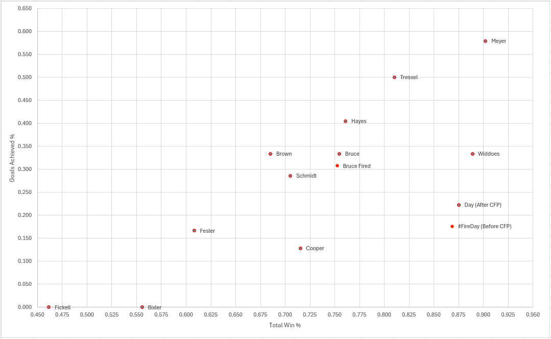 Broadly speaking, it seems like Ohio State coaches get into trouble when the sum of their win percentage and percentage of goals achieved dips below 1. Coaches who keep their win percentage above .750 and average at least 1/3 of their team goals over their tenure are going to stay very comfortable, while anyone below the line formed by the red dots is likely on the hot seat. Interestingly, Paul Brown is below the line, but is still honored with his name on the stadium. Exceptions are clearly available for world wars, short tenures, and contributions to professional sports in Ohio.