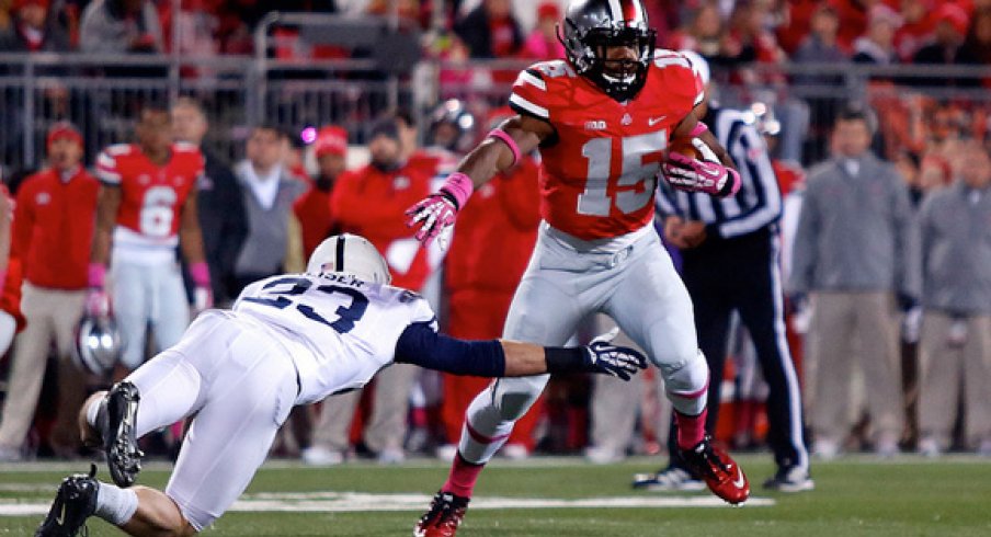 In an embarrassment of Bill O’Brien’s Nittany Lions, the Buckeyes found themselves up 56-7 with 10 minutes left to play in Columbus. At the controls were Kenny Guiton and EzE, spelling the victorious Miller and Hyde who cooled their heels on the sideline. Braxton may not have been in the game, but Elliott certainly did his best to emulate him here. Nothing like successfully eluding a blitzing safety who is immediately in the backfield, only to charge forward for an impressive first down.