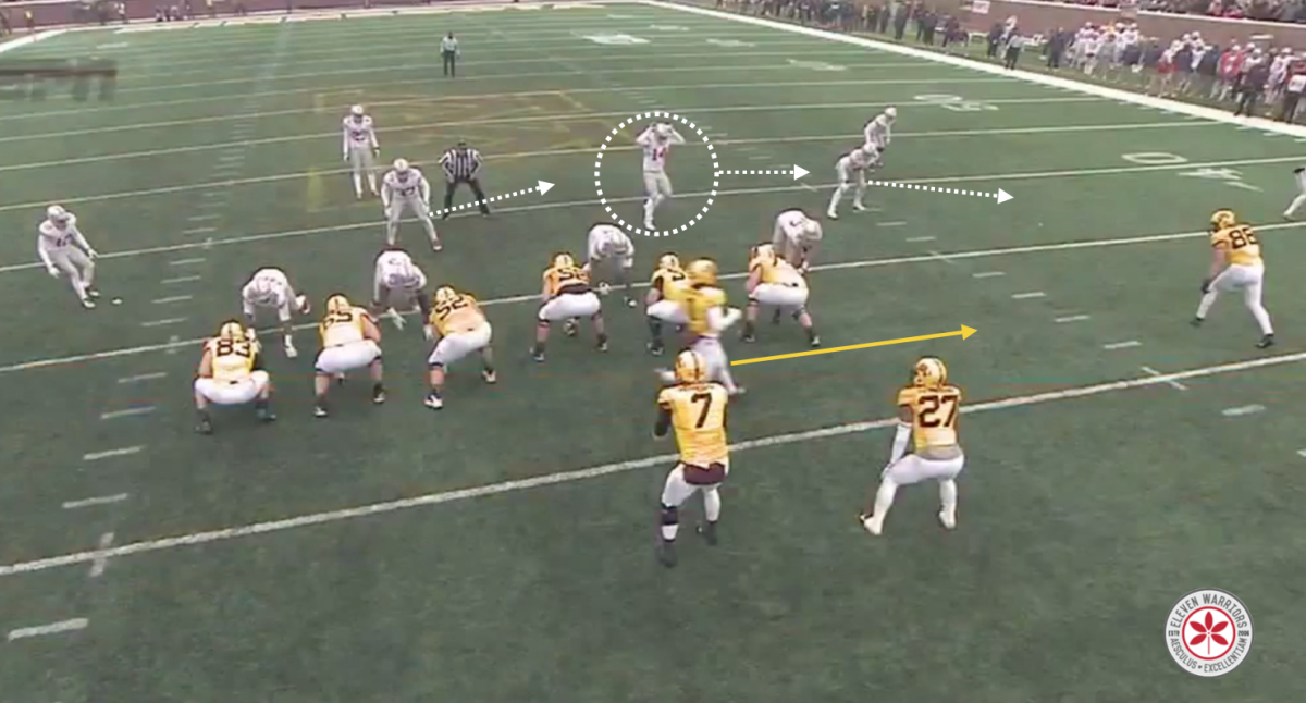But when Maye went in motion, middle linebacker Curtis Grant immediately recognizes that the Gophers are in a 3x1 formation, with the only threat to the weak side being a blocking tight end, and shifts the entire defense toward the strength of the formation.