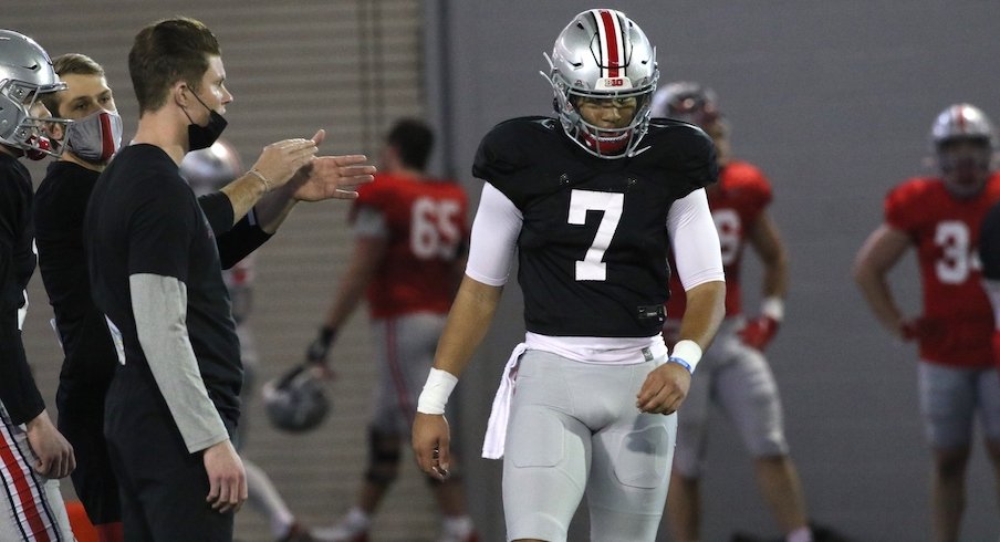 While Ohio State does appear to be splitting reps between the three scholarship quarterbacks about as equally as possible, C.J. Stroud was the first quarterback in the passing order throughout the portion of Friday’s practice that was open to the media, followed by fellow second-year Jack Miller and true freshman Kyle McCord.