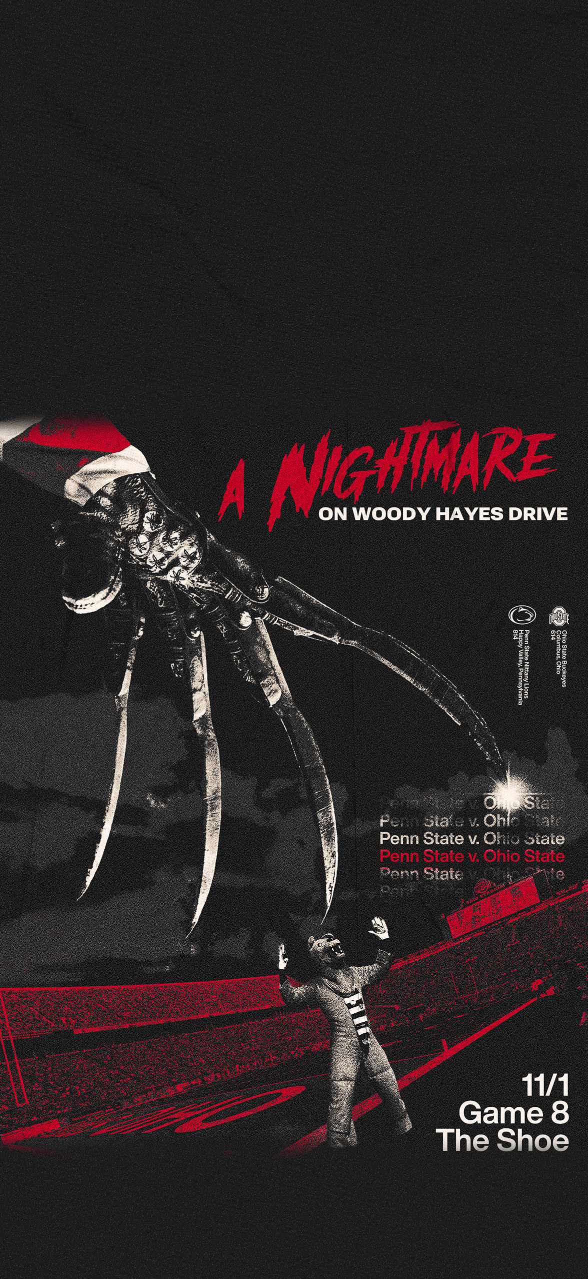 Freddy Krueger, the fictional character and lead antagonist of the horror film franchise A Nightmare on Elm Street, was the inspiration for this week's Penn State Game Poster, which features Brutus wearing Krueger's trademark four claws hovering over the Nittany Lion.