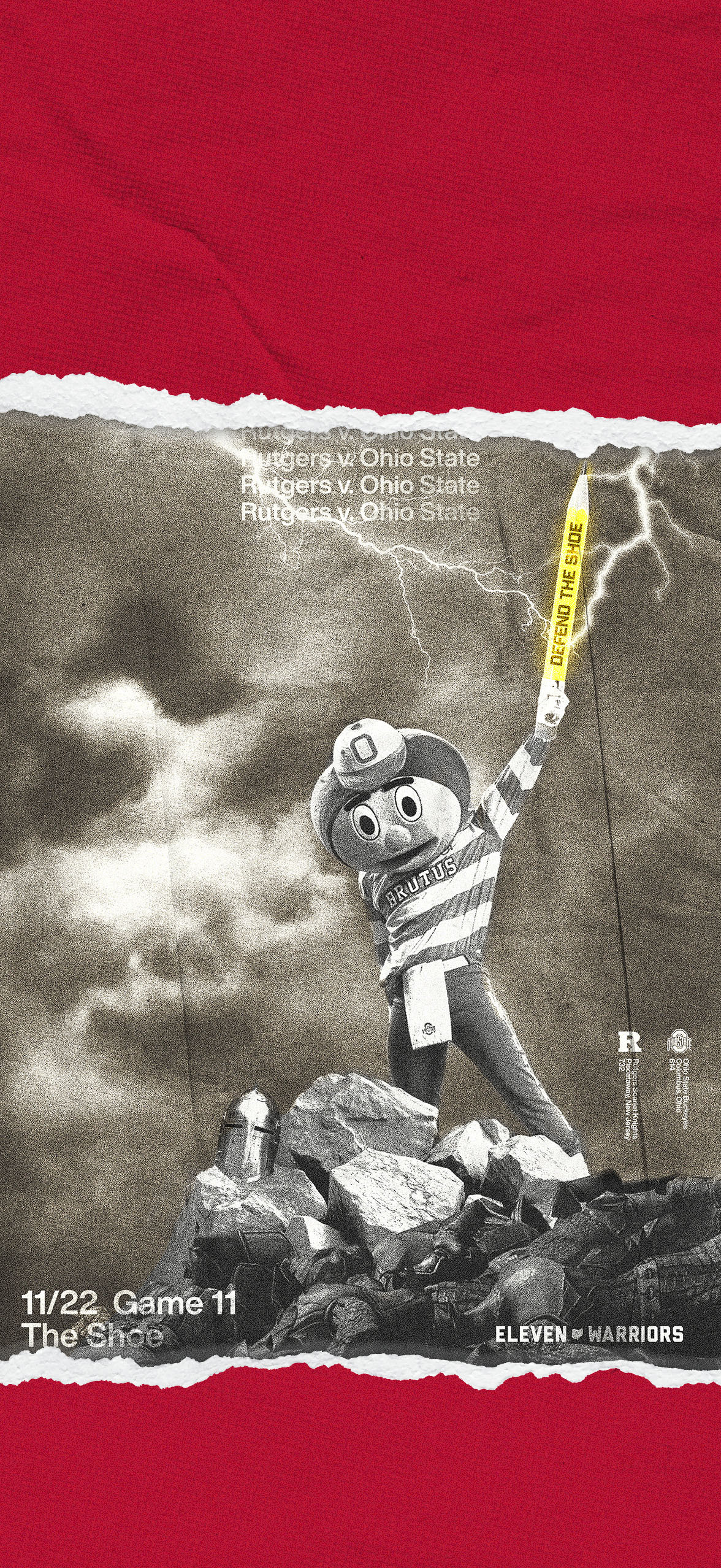 The Rutgers Game Poster, designed by Sam Harachis of Mythios Design Co., continues the beloved series of Eleven Warriors Game Posters. Creative director Walt Keys started the tradition for Ohio State vs. Miami (OH) in 2012, Urban Meyer's debut as the Buckeyes' head coach. Keys led the project for a decade before passing the torch to Harachis in 2022.